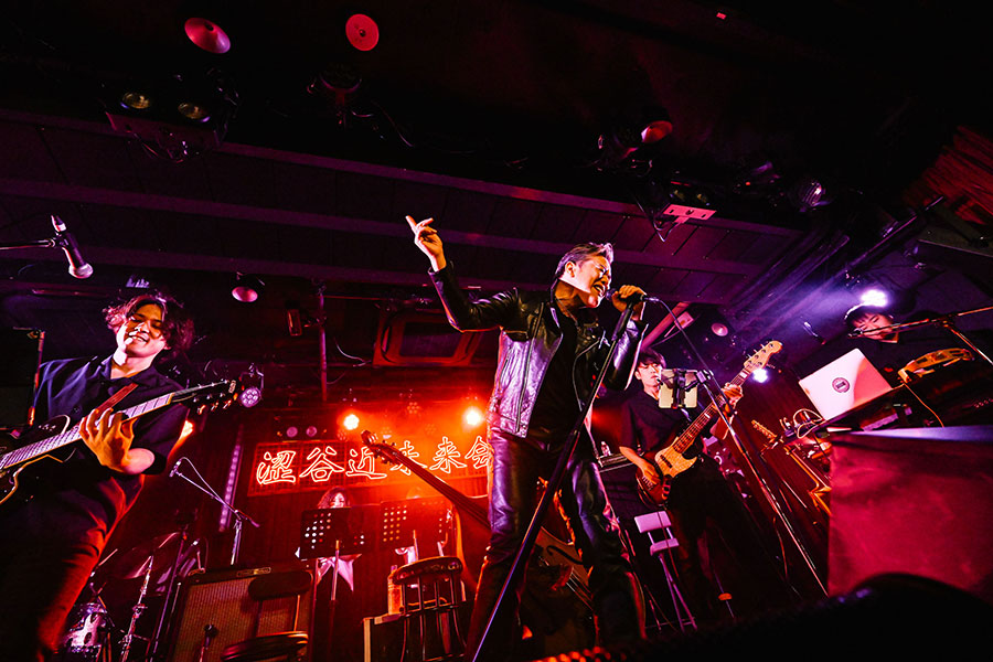 7月だって上澤津孝はもちろん革ジャン革パンだ。1曲目「東京ストリートロッカー」から、分厚いブラスセクションとご機嫌なロッカ・スウィングビートに乗ってぶっ飛ばす。脇を固めるのはバンマス・幡宮航太(key、Co&AG)を中心に、石井洋介(G)、奥野翔太(Wood&Electric B)、田辺貴広(Dr)、そして「KUNOICHI」として長谷川素子(Tp)、枡家小雪(Tb)、矢元美沙樹(T.Sax)のブラスセクションに加え鈴木一葉(Key)という新顔を含むフレッシュなメンバー。飛ばせ、飛ばせと煽りながら「クルージングナイト」「あの夏が聴こえてくる」と、MAGICナンバー3連発で波に乗る。声がよく出ている。目が輝いている。熱い夜になりそうだ。